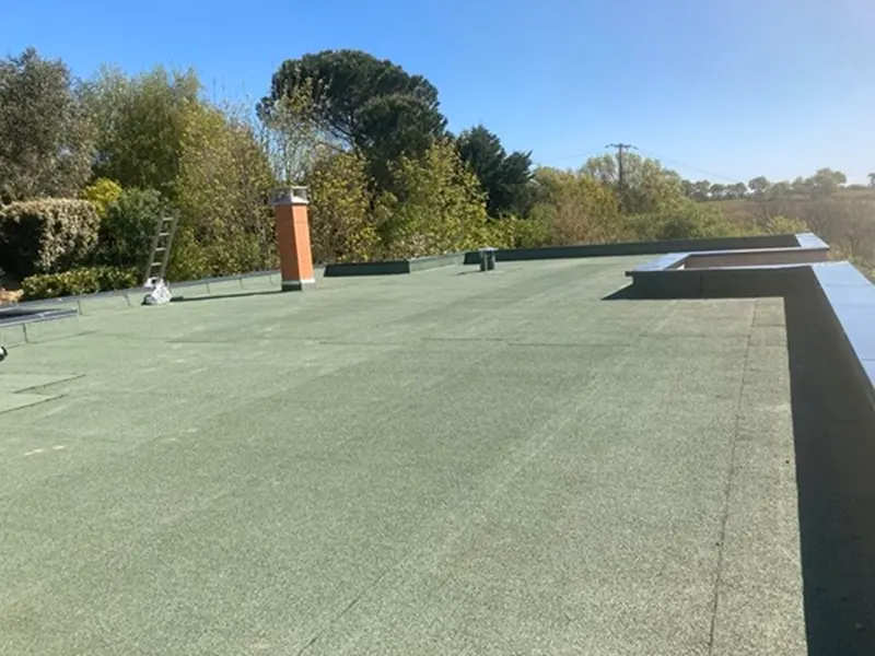 Étanchéité de toit terrasse avec un complexe bicouche et finition auto protéger par paillettes d’ardoise vert Normandie.